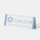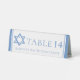 Ce numéro de table de fête de Bat Mitzvah bleu clair avec un panneau de tente a une belle et artistique étoile de David dessinée en haut. Complet avec votre nom personnalisé sur la décoration blanche.