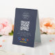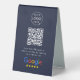 A simple custom navy blue 4x6 business tabletop plastic double-sided table tent sign in a modern minimalist style, designed to feature a scannable QR code that links directly to your Google Reviews page. This versatile template can be personalized with your company logo, graphic, or photo, along with your QR code and a custom message that encourages customers to share feedback. The review platform logo can also be swapped for Yelp, TripAdvisor, Facebook, or any other site to create a bespoke and professional design that suits your business. Perfect for cafes, salons, boutiques, offices, and service-based brands, this clean display helps boost engagement and grow your reputation. Tip: Use the free GatherUp Review URL Generator to create a direct link to your review page before generating your QR code.