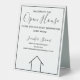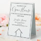 Ce panneau de table Open House noir et blanc élégant est fait sur mesure avec votre nom de société immobilière et les coordonnées de l'agent immobilier. Impressionnez les nouveaux clients d'achat de maison avec cette signalétique simple et chic avec ce panneau de typographie classe. Un dessin moderne et minimaliste d'une maison se trouve sous l'information de l'agent immobilier.