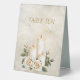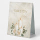 Une très belle et délicate cérémonie aux chandelles mariage numéro de table signe de tente jaune pâle avec roses blanches, bougies blanches et design rose.