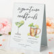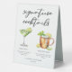 Ce bar mariage signature cocktails panneau de tente de table comprend une simple typographie noire au-dessus de 2 de vos boissons préférées et leurs ingrédients pour votre réception. Un dessin chic Margarita et Moscow Mule ajoute une touche ludique à votre menu bar. Complétez avec les noms du couple et la date de leur réception.
