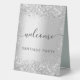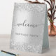 Un signe de bienvenue pour une fête. Un arrière - plan élégant à l'allure fausse argent décoré de confettis. Personnalisez et ajoutez votre nom. Lettres noires.