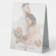 Un élégant panneau de table mariage en terre cuite d'automne sur le thème bohème avec une calligraphie en lettrage accentué par des roses aquarellés dessinés à la main, l'herbe de pampas et feuille de palmier. À l'arrière, vous pouvez placer une photo de votre propre et modifier le nom de la mariée et du marié. (Crédits photos à Jonathan Borba de Unsplash. Veuillez le remplacer par le vôtre.)