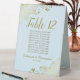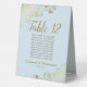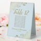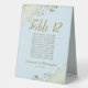 Ces élégants panneaux de tentes dorées et bleu clair en poudre faciliteront la recherche de sièges à vos invités, et rendront votre réception de mariage plus belle. L'établissement présente un design simple avec un titre de calligraphie de script en dentelle avec le numéro de table et l'espace pour les noms de 10 invités. Ci-dessous, il y a de l'espace pour les noms du couple et la date du mariage. Les coins sont décorés de boucles et tourbillons fleuris en dentelle. Une excellente façon d'ajouter une touche de classe formelle à votre réception.