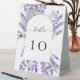 Un élégant fond blanc décoré d'un cadre en arc de cercle de violet, fleurs de lavande. Personnalisez et vos numéros de table. Lettres noires.