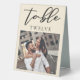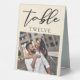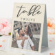 Cette simple et élégante table de mariage d'ivoire numéro de table signe de tente comporte une typographie noire chic au-dessus d'une photo fiançailles. Ajoutez vos photos de couple romantiques préférées pour vos tables.