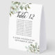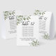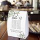 Ces magnifiques panneaux de tentes de numéro de table comprennent un tableau ou une liste de dix noms pour aider vos invités à trouver la table correcte à votre réception de mariage. L'aquarelle rustique peinte à la main présente des sprigs de feuilles d'eucalyptus et de la verdure dans les tons menthe, mousse et vert sauge. Le titre est écrit en calligraphie script élégante avec la place pour les noms de couple et mariage date ci-dessous.