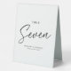 signe de tente de numéro de table mariage avec un arrière - plan blanc simple qui peut être changé en n'importe quelle couleur, le numéro de table "sept" dans une police de script élégante, les noms de couples, et la date.