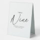 signe de tente de numéro de table mariage avec un arrière - plan blanc simple qui peut être changé en n'importe quelle couleur, le numéro de table "neuf" dans une police de script élégante, les noms de couples, et la date.