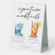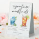 Cette signature chic mocktails panneau de tente de table comprend une simple typographie noire au-dessus de 2 boissons mignonnes et leurs ingrédients pour votre bar mariage d'été. Une boisson Blue Hawaiian Sunrise et une boisson non alcoolisée Arnold Palmer ajoutent une touche cool à votre menu du bar. Complétez avec les noms du couple et la date de leur réception.