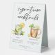 Ce panneau de tente de table à cocktails sophistiqué présente une typographie noire simple au-dessus de 2 de vos boissons préférées et de leurs ingrédients pour votre bar mariage côtier. Un dessin chic Mojito et Moscow Mule ajoute une touche ludique à votre menu bar. Complétez avec les noms du couple et la date de leur réception.