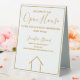 Ce panneau de table Open House en or et blanc élégant est fait sur mesure avec le nom de votre entreprise immobilière et les coordonnées de votre agent immobilier. Impressionnez les nouveaux clients d'achat de maison avec cette signalétique simple et chic avec ce panneau de typographie classe. Un dessin moderne et minimaliste d'une maison se trouve sous l'information de l'agent immobilier.