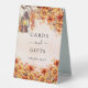 Un fond dégradé rose doré rustique, rose blush. Décoré avec une lanterne vintage et des fleurs orange. Texte : Cartes et cadeaux, merci !