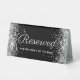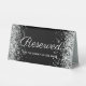 Créez votre propre place réservée mariage table signe de tente pour la fête de la mariée, la famille de la mariée, ou la famille du marié. Le design comporte une parties scintillant en argent brillant et faux girly sur les bords latéraux sur un arrière - plan noir solide. On peut customiser à la fois l'élégante calligraphie et la police moderne de caractères casquette.