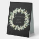 Un élégant panneau de table de mariage noir pour votre station de programme. Avec des snowberries et de l'eucalyptus peints à la main disposés en une belle couronne botanique. Tout le texte est entièrement modifiable afin que vous puissiez modifier le message et changer le style/couleur/taille de la police. Articles coordonnés disponibles.