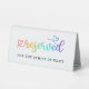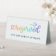 Panneau de tente de table de mariage réservé LGBT avec un script de coeur rempli d'un dégradé arc-en-ciel.