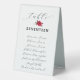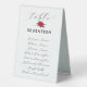 Wedding seating tabletop tent sign with list of guests' names. White sign with black text and a single red rose. All text and images are the same on both sides. The table number is printed out, with "Table" at the top. Use the eight lines (or less) to list each guest's name that will sit at this table. Signs will arrive flat and are easy to fold to stand.