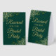 Ce simple panneau de table permettra à vos invités mariages de savoir quels espaces sont réservés à la fête de la mariée. Le design sobre vert émeraude et or présente des lettres de script élégantes avec des boucles décoratives et des tourbillons dans les coins.