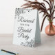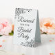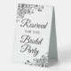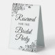 Ce simple panneau de table permettra à vos invités mariages de savoir quels espaces sont réservés à la fête de la mariée. Le design simple en noir et blanc présente un élégant lettrage avec des boucles décoratives et des tourbillons dans les coins.