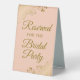 Ce simple panneau de table permettra à vos invités mariages de savoir quels espaces sont réservés à la fête de la mariée. Le design simple en corail pâle ou couleur pêche présente d'élégants lettrages en or avec des boucles et des tourbillons décoratifs en fausse feuille dorée dans les coins.