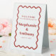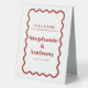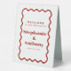 Améliorez votre décor mariage avec ce panneau de tente de table rouge foncé Wavy Edge des années 1950, conçu pour ajouter une touche de charme vintage à votre journée spéciale. Doté d'un arrière - plan blanc immaculé encadré d'une audacieuse bordure ondulée rouge foncé, ce design classique évoque l'élégance des années 1950. Les noms de la mariée et du marié ainsi que la date du mariage sont affichés dans une police rouge foncé, en ajoutant un détail personnel et élégant. Parfait pour les numéros de table, les sièges réservés, les affichages de menu ou les messages spéciaux, ce panneau d'inspiration rétro apporte un élément intemporel et sophistiqué à votre célébration mariage.
