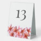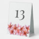 Numéro de table de mariage avec fleurs de plumeria rose. Grande, tentée panneau a des fleurs roses au fond des deux côtés. Ajoutez un numéro de tableau qui s'imprime sur les deux côtés. Des panneaux en plastique blanc sont visibles à la réception.