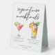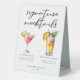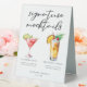 Cette signature chic mocktails panneau de tente de table est simple tyopgraphie noire au-dessus de 2 boissons mignonnes et leurs ingrédients pour votre bar mariage. Une Cutie de canneberge ou Cosmopolite non alcoolisé et une Piña Colada vierge ajoutent un flair cool à votre menu bar. Complétez avec les noms du couple et la date de leur réception.