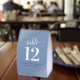 Ces magnifiques panneaux de tentes de table faciliteront la recherche de tables à votre réception de mariage. L'élégant design bleu clair présente une calligraphie en dentelle avec des boucles florales gris argenté ornées et des tourbillons dans les coins. Il y a de la place pour les noms du couple et la date du mariage.