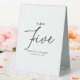 signe de tente de numéro de table mariage avec un arrière - plan blanc simple qui peut être changé en n'importe quelle couleur, le numéro de table "cinq" dans une police de script élégante, les noms de couples, et la date.