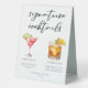 Ce panneau de tente de table à cocktails sophistiqué présente une typographie noire simple au-dessus de 2 de vos boissons préférées et de leurs ingrédients pour votre bar mariage côtier. Un dessin chic cosmopolite et Whiskey Sour ajoute une touche amusante à votre menu de bar. Complétez avec les noms du couple et la date de leur réception.