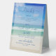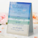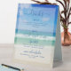 Ce magnifique panneau de tente de table de menu de boissons de mariage de plage dispose d'une magnifique photo des vagues de l'océan pour un événement de destination. Jolie photographie de plage associée à une élégante typographie blanche et bleue crée un menu de bar chic et moderne pour votre soirée sur l'île tropicale ou le luau côtier.