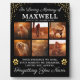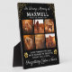 Plaque photo personnalisée de chien avec 6 précieuses photos de votre animal de compagnie bien-aimé, empreintes de pattes en forme de cœur doré et paillettes, le texte "à la mémoire de", le nom de votre chien, dates de naissance et de décès, et la citation de condoléances "nous regrettons votre présence, nous chérissons votre mémoire, vous aimant toujours, ne vous oubliant jamais"