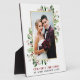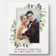 Elégante aquarelle Verdure d'hiver Notre première plaque photo Mariage de Noël nouvellement mariée comprend des feuilles d'eucalyptus et des baies sèches rouges. Cadre Or.