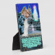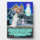 Belle plaque d'écritures 5 x 7 Eskie et Angel, avec un chevalet, d'une scène hivernale colorée et détaillée avec un chien d'esquimau blanc-américain, souillé et sans abri qui est perdu dans une tempête de neige. Le chien est à genoux et prie avec des pattes ensemble à un Être céleste angélique glorieux. Elle a une belle aura violette et blanche autour de la tête et est à l'entrée d'une maison de charme. Elle a ouvert la porte de fer pour le chien perdu et accueille le chien à travers la porte avec des mains tendues. Elle a sanctifié cette maison comme la nouvelle maison du chien en l'enveloppant de mousseux bleus du Ciel. Cette scène accompagne le verset biblique Matthieu 6:33, "Mais cherchez d'abord le royaume de Dieu, et Sa justice; et toutes ces choses vous seront ajoutées." Cette plaque fait un merveilleux cadeau ou peut être utilisée pour nous rappeler la Parole de Dieu.