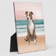 Plaque Photo Chien Pitbull mignon assis sur la plage avec couch