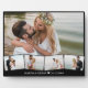 Affichage photo cool pour 5 de vos photos mariages préférées. Le modèle photo affichera votre photo principale comme l'arrière - plan et les 4 autres seront disposés dans une bande photo zigzag le long du fond. Vous pouvez personnaliser le libellé avec votre choix de texte, comme le nom de la mariée et du marié et la date du mariage.