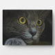 Un gros plan du visage d'un chat gris aux yeux jaunes et des pupilles dilatées, reposant sa tête sur sa patte et regardant attentivement quelque chose derrière la caméra.