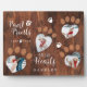 Chérissez les merveilleux souvenirs pour toujours avec notre plaque photo personnalisée d'empreintes de pattes de compagnie multiples à grain de bois faux. Notre design comporte quatre cadres photo d'empreintes de pattes pour afficher vos photos de compagnie spéciales. " Empreintes de Patte sur Nos Cœurs " est affiché dans une calligraphie moderne à pinceau blanc. Personnalisez avec le nom du compagnon, l'année de naissance et l'année de disparition avec un design d'empreinte de patte en forme de cœur mignon.