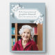 Des fleurs blanches délicates ornent cette simple plaque photographique de service commémoratif gris-bleu. En mémoire d'amour de votre nom personnel aimé et des dates entre les magnifiques fleurs de cerisiers fleuris. Ce joli panneau commémoratif à l'ancienne présente une photo complète de votre parent. Parfait pour un service funéraire ou une célébration de la vie.