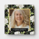 Plaque photo carrée de célébration de vie avec un fond noir élégant, des fleurs botaniques blanches élégantes, une photo de votre proche dans un cadre doré faux, leur nom et dates de naissance et de décès.