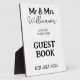 Cette plaque de livre d'or en noir et blanc mariage met en vedette Mr & Mrs et le nom de famille des couples heureux en gras noir et en écriture élégante. Pour modifier le texte, cliquez sur le bouton Personnaliser.