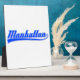 Manhattan, New York City, écrit avec un swash (queue). Polices en blanc et bleu. Conception de texte originale.