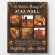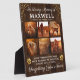 Plaque photo de chien personnalisée avec un fond en bois rustique, 6 photos précieuses de votre animal de compagnie bien-aimé, empreintes de pattes en or & paillettes, le texte "en souvenir de", le nom de votre chien, dates de naissance et de décès, et la citation de sympathie "nous regrettons votre présence, nous chérissons votre mémoire, vous aimant toujours, vous oubliant jamais"
