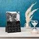 Gardez la personne que vous aimez à proximité avec une plaque de bureau du calendrier 2024 personnalisée. Remplacez l'exemple de photo et les noms par les vôtres dans la barre latérale. Le texte personnalisé est dans une police de script blanc élégante. Ci-dessous, c'est un calendrier blanc facile à lire sur un arrière - plan noir. Fait un grand cadeau personnalisé pour les vacances. Copyright de la conception du calendrier © Claire E. Skinner. Tous droits réservés. Photographie © Storytree Studios, Stanford, CA