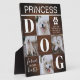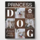 Plaque de photo en hommage au mémorial d'animal de compagnie avec 4 photos de votre chien adoré, un fond à motif de bois rustique, des lettres qui épellent CHIEN, les mots "à jamais dans nos cœurs", une patte de chien avec une phrase de souvenir, et leur nom.