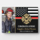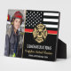Cette conception comprend un drapeau de pompier avec des rayures noires et blanches, ainsi qu'une fine bande rouge. "Félicitations" et l'insigne d'un pompier est au-dessus du nom du pompier diplômé. Cette conception fonctionne également bien pour les pompiers, les lieutenants ou les chefs qui prennent leur retraite. Célébrez en style avec cette bannière photo personnalisable!