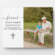 Élégante plaque de souvenir photo en mémoire d'un membre de la famille très aimé. Le libellé du souvenir se lit "pour toujours dans nos coeurs" et est écrit en écriture manuscrite et en majuscules. Vous pouvez ajouter votre texte personnalisé, tel que In loving memory of ... et le modèle photo est prêt pour vous d'ajouter une de vos photos précieuses. La conception est terminée avec une croix, que vous pouvez enlever si vous le souhaitez (cliquez sur "customiser plus loin").