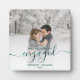 Commémorez votre fiançailles avec cette belle plaque de gardien moderne. Le texte bleu turquoise dit "Notre premier Noël engagé", avec le mot "engagé" dans un élégant script d'écriture de faux papier avec des fleuris avant et après. Remplacez l'exemple d'image par votre photo préférée, et ajoutez vos noms et l'année. Un filtre en dégradé blanc permet de faire apparaître le texte.