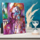 Scène de balcon de Romeo et Juilet tragédie par William Shakespeare .Tableau d'aquarelle contemporaine avec feuille d'or et couleurs irisées en violet clair, rose, vert, jaune orange, turquoise, turquase, blanc ..Peinture par Bulgan Lumini (c)