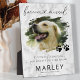 Élégante plaque photo mémorial animal de compagnie avec un fond en faux marbre, une photo de votre chien ou chat, des empreintes de pattes, la phrase 'à jamais regretté' qui incorpore un cœur, leur nom, dates de naissance et de décès, et la phrase de sympathie 'si j'avais pu te sauver, tu aurais vécu pour toujours'.